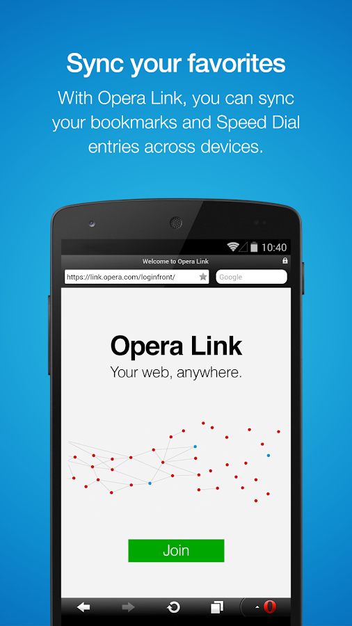 ✔ Be social: Opera Mini plays well with others. It works on just about any mobile phone that can connect to the internet!